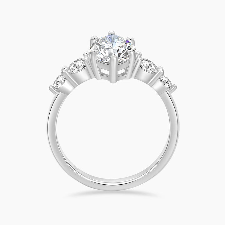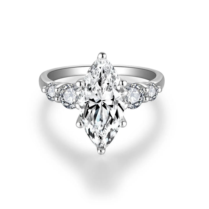A luminous symphony of light and grace, this 3 carat marquise-cut moissanite ring reflects the purest form of brilliance. At its heart rests a D color, VVS clarity moissanite—elongated to perfection, capturing every glimmer like a whisper of starlight. Four delicate round accents trace the curve of the 925 sterling silver band, adding depth, harmony, and quiet splendor. A timeless expression of love and light, where elegance meets everlasting brilliance.