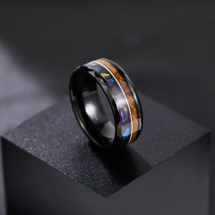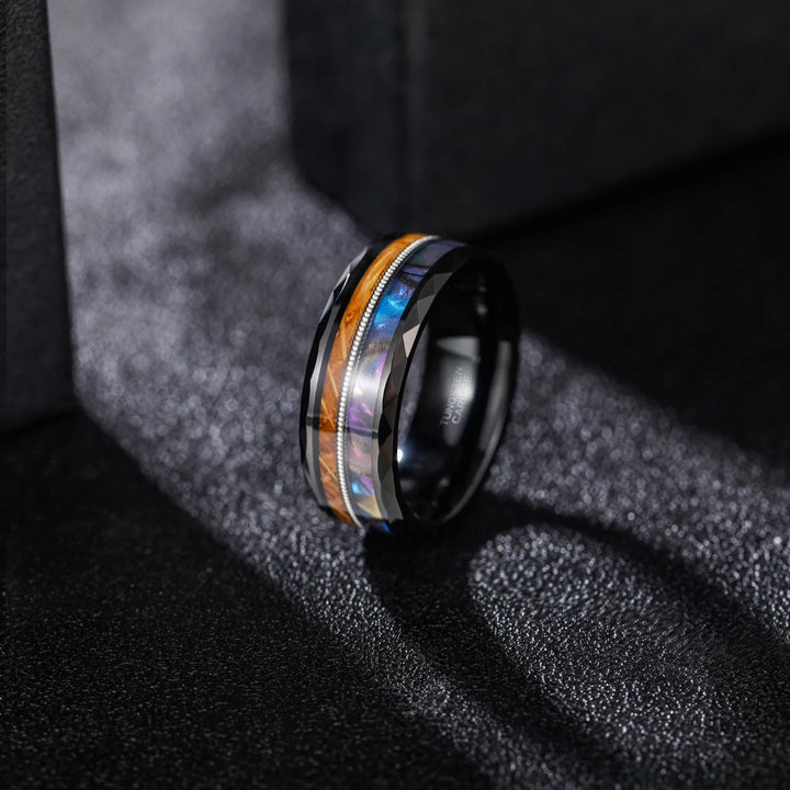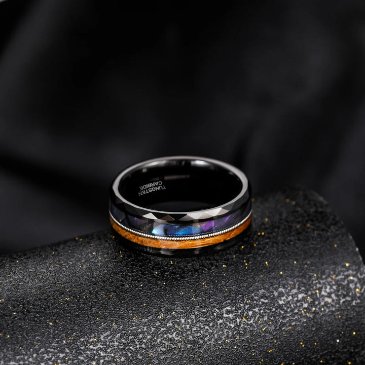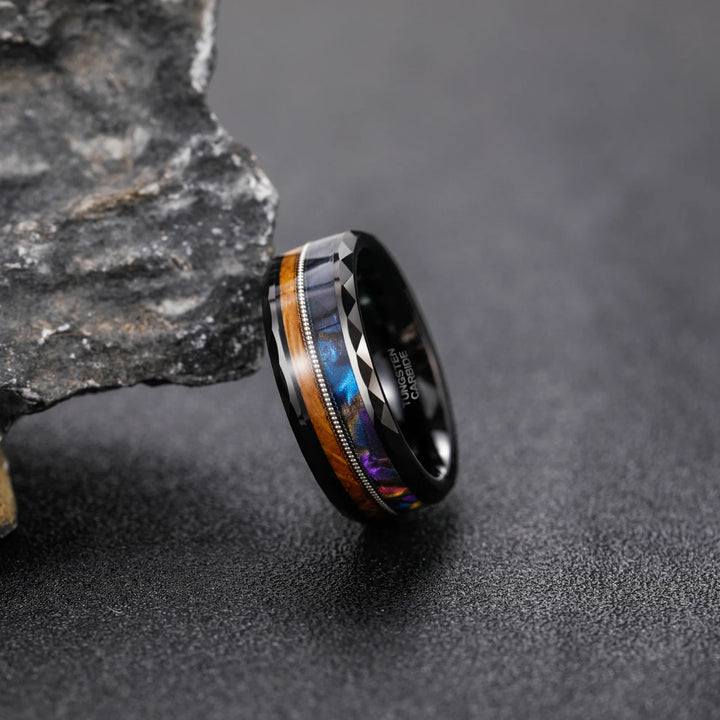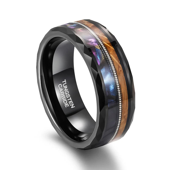 This 8mm tungsten ring features a striking aurora-inspired multicolor galaxy inlay paired with genuine wood and a guitar string detail, creating a bold and artistic statement; the black tungsten interior adds a sleek contrast while the upper and lower edges are crafted with angled faceted cuts that enhance the ring’s modern geometric look, making it the perfect choice for men who appreciate creativity, craftsmanship, and a uniquely expressive style.