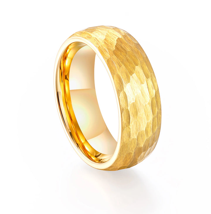 This 8mm men’s tungsten carbide ring features a luxurious 24K gold plating with a hammered finish, giving it a bold yet sophisticated look. Designed as a combined band, it balances rugged durability with elegant style, making it perfect for men seeking a standout 24K gold ring.