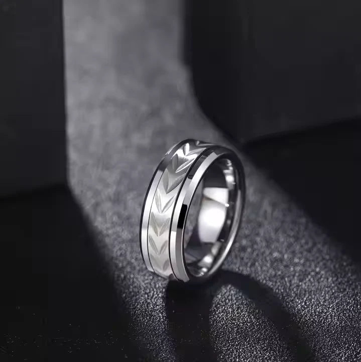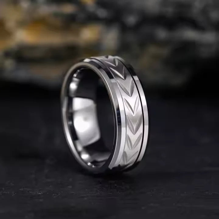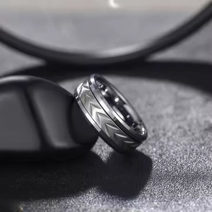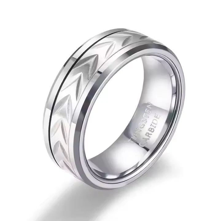 This 8mm men’s tungsten ring features a bold mechanical design with a continuous arrow cycle pattern at the center, finished in sleek silver. Crafted from durable tungsten, it combines industrial strength with a modern aesthetic, making it a striking choice for men who appreciate both style and resilience.