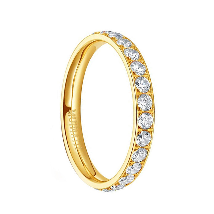 This Gold Eternity Engagement Ring is made of real titanium and has a width of 3 mm. The sparkling Eternal Ring shines from multiple angles of cubic zirconia, creating stunning reflections. Cubic zirconia is so beautiful and sparkling - just like a real diamond with a golden look that sets you apart from the crowd and becomes the focus. It's suitable for all occasions, can be used for a variety of purposes. We offer a free engraving service to make your ring more unique. If you have any questions, please feel free to contact us. We have the most professional customer service team, and strive to create the best service for you.